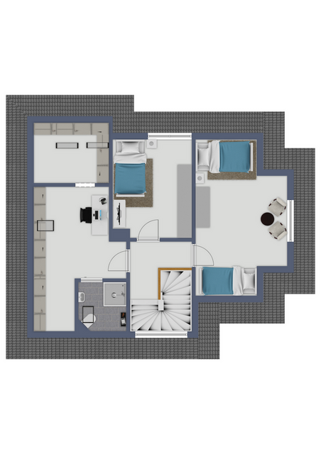 Das ausgebaute Dachgeschoss bietet zusätzlichen Wohnraum mit drei Zimmern, einem Duschbad sowie einem Flur.