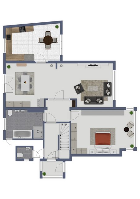 Die erste Etage präsentiert sich mit einem offenen Wohn-Eßzimmer mit einem Kamin, einem Schlafzimmer – ideal für geselliges Beisammensein. Auch hier finden Sie eine eigene Küche und ein Badezimmer mit Badewanne – perfekt für die Nutzung als eigenständige Wohneinheit.