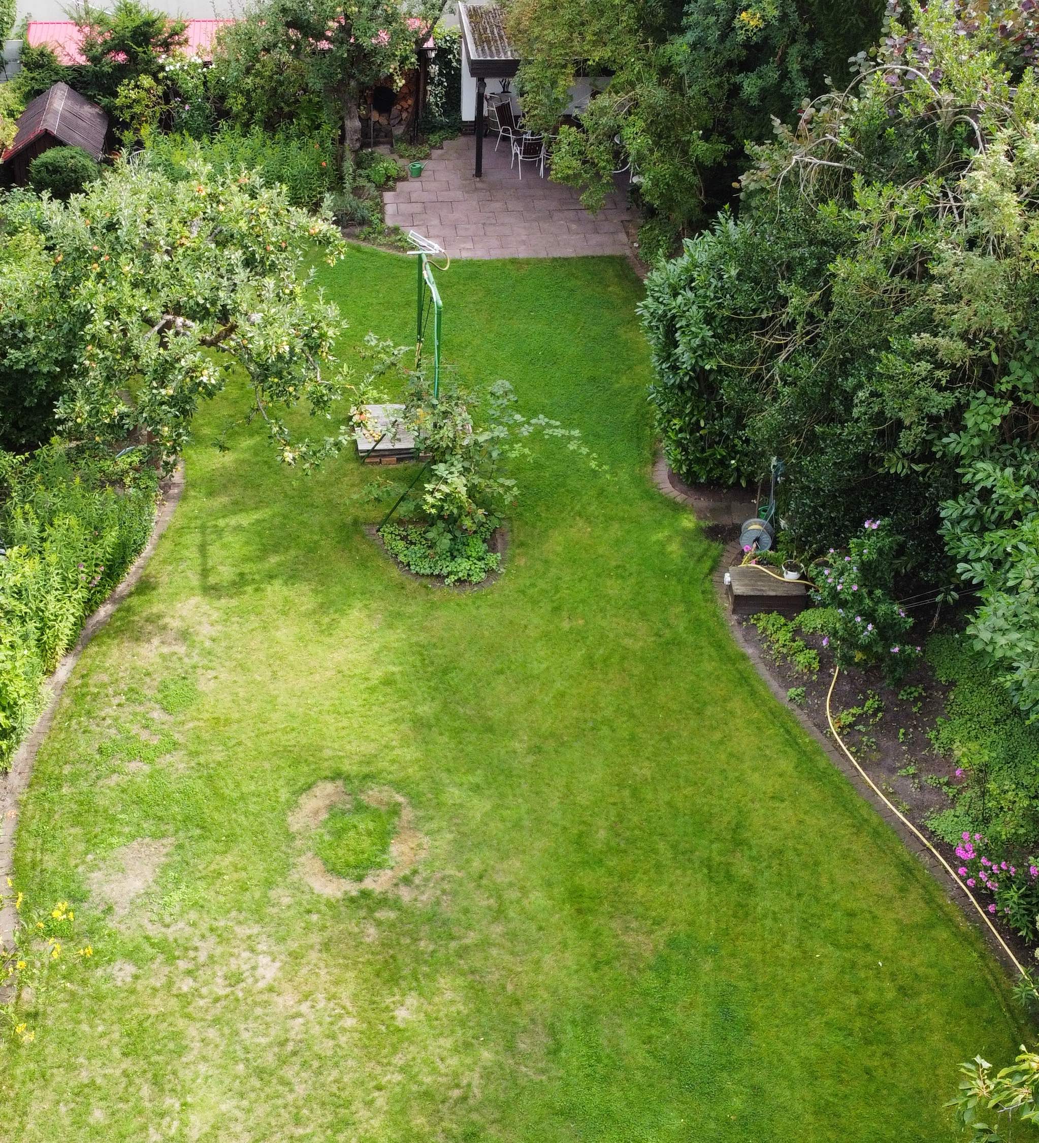 Der Garten ist dank des alten, gewachsenen Baumbestands angenehm abgeschirmt und nicht einsehbar – ein idyllischer Rückzugsort mit maximaler Privatsphäre.